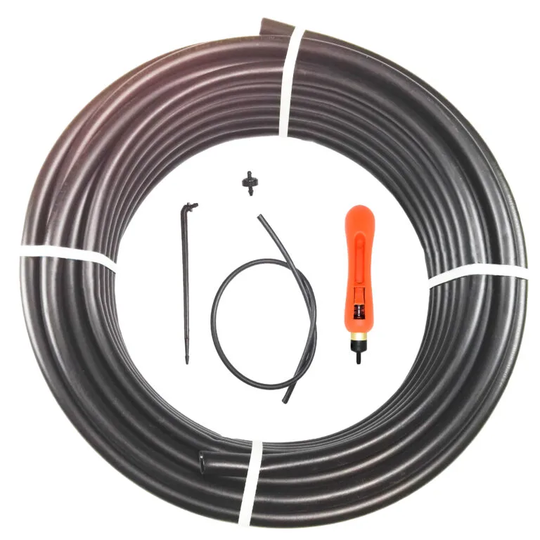 Kit de riego para maceteros, compuesto por: -25m tubería polietileno ø16mm. -25m microtubo 5x3mm. -25 piquetas NETAFIM 3x5mm. -25 goteros PCJ 2l/h. -1 sacabocados para goteros.